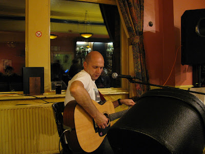 After him was a quiet, nervous-seeming guy in a grey coat and scarf, called Ian. He turned out to be an extremely accomplished guitarist, pulling out lots of jazzy, chilled-out chord progressions, funky little licks and percussive slaps, rapping out a beat on the scratchplate while dropping in acappella sections, singing in a beguiling tremelo, smiling amiably all the while. I chatted to Ian later, and he was a lovely chap. He said he’d always performed in front of audiences, ever since he used to read out Bible passages and suchlike during his father’s sermons. He said he’d pretty much lost his faith now, and he worked three hours a day as a cleaner for McDonalds, but that left him with time to practise, write, and go out to nights to perform.