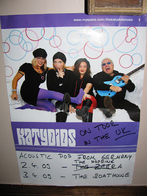 I wasn’t particularly nervous. It was a home gig, at a mixed discipline night that I expected would include a few shy poets reading off scraps of paper, some songsmiths busting out their latest ballad, and maybe an errant stand-up or two dying on their arses. The complexion of the night changed a little when The Katydids were added to the bill, a band from Germany fronted by an English singer who had lived in Germany most of her life and called the Deutsch-English pidgin she often spoke now as ‘Dinglish’. They were doing a tour of the UK, were in Cambridge anyway, and had asked if they could join in.